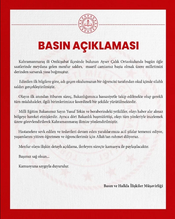 Kahramanmaraş’ta Ayser Çalık Ortaokulu’nda meydana gelen silahlı saldırıda 4 kişi hayatını kaybetti, 20 kişi yaralandı.